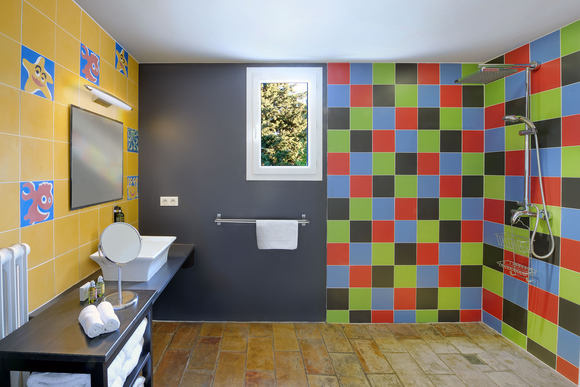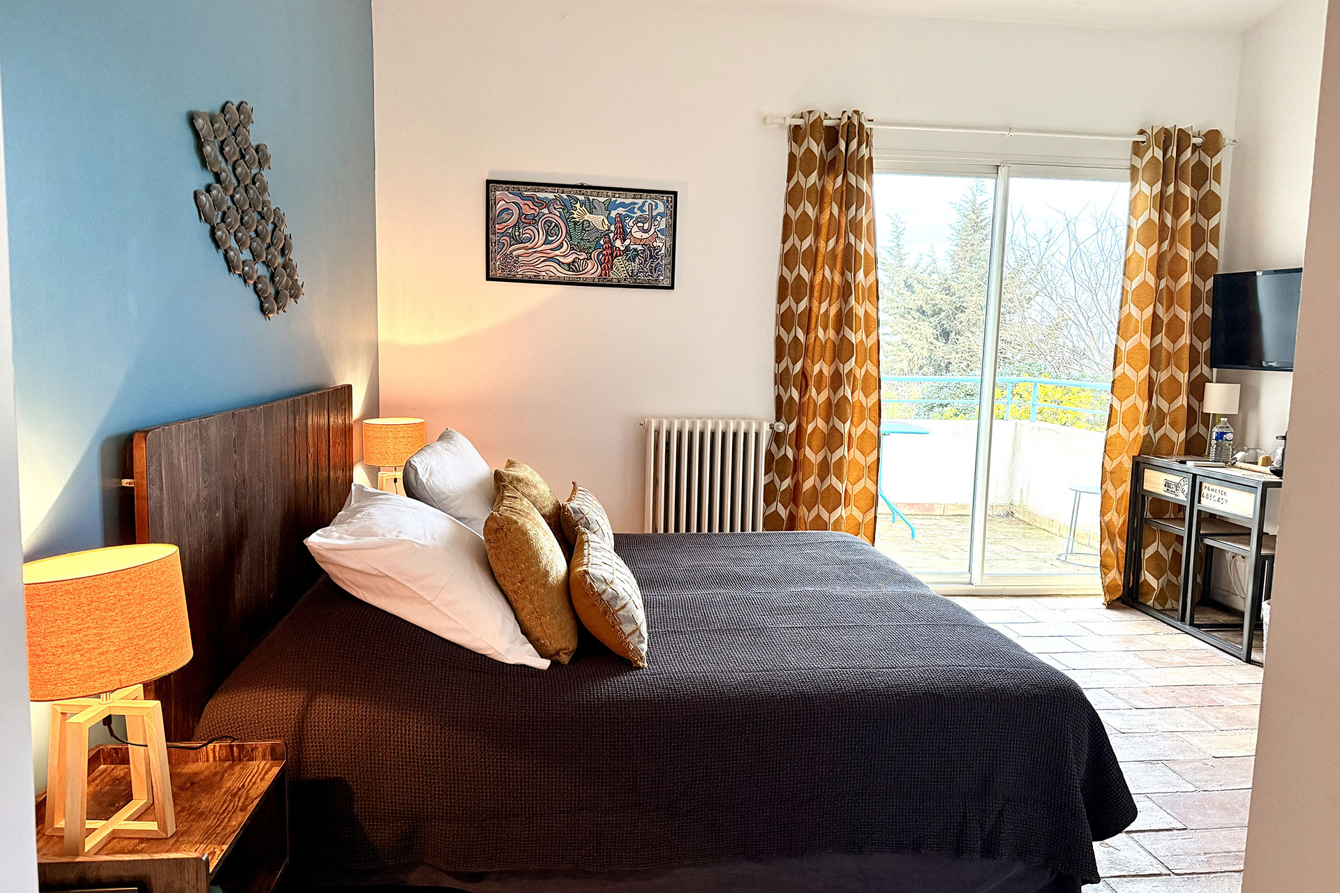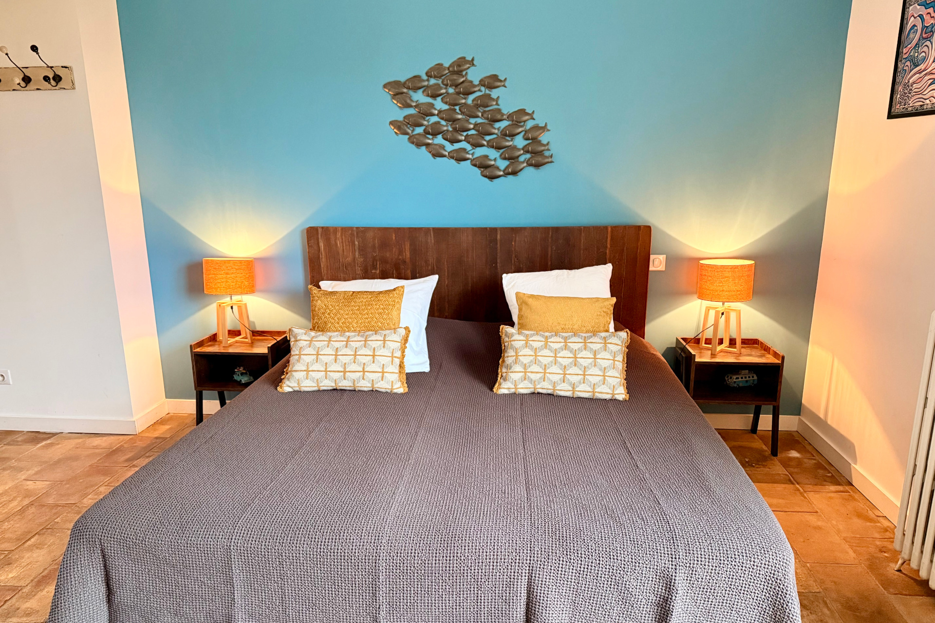 Voyez la vie en couleur dans cette chambre pour 2 personnes avec son sol en pare feuille et sa décoration inspirée par l’artiste sétois Di Rosa!!