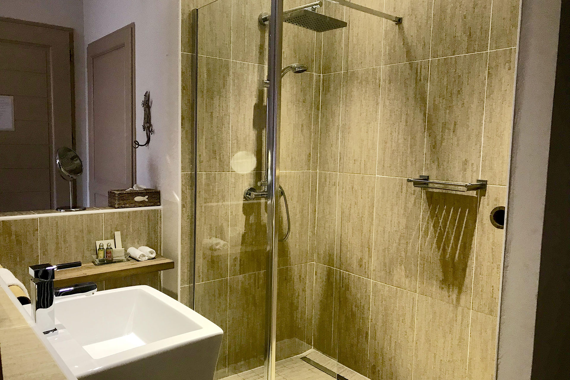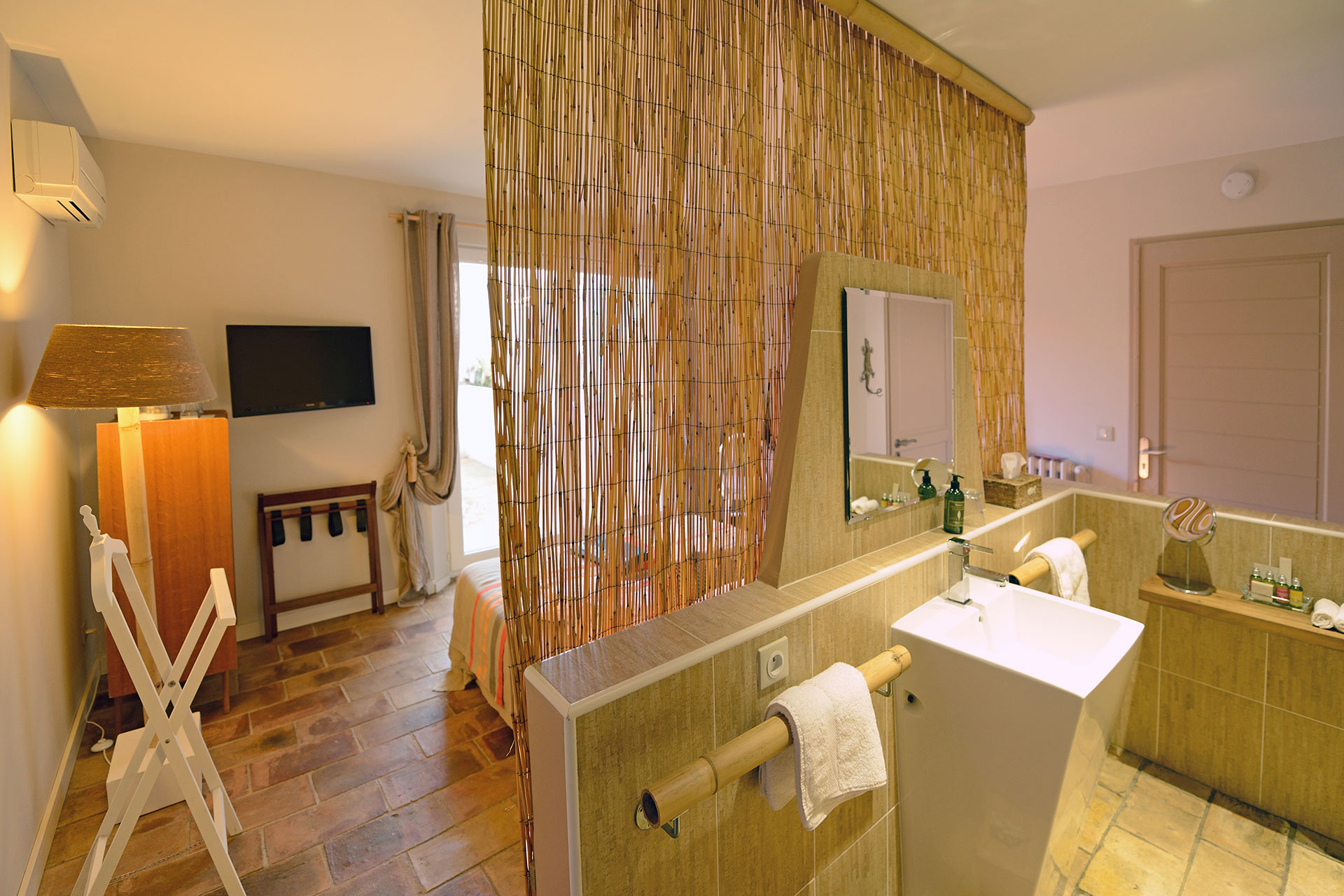 Sa salle de bain avec douche à l’italienne est ouverte sur la chambre et les produits de beauté L’Occitane en Provence vous envoûteront par leur parfum de vacances; Ne vous encombrez pas d’un sèche cheveux, il vous attend déjà !
